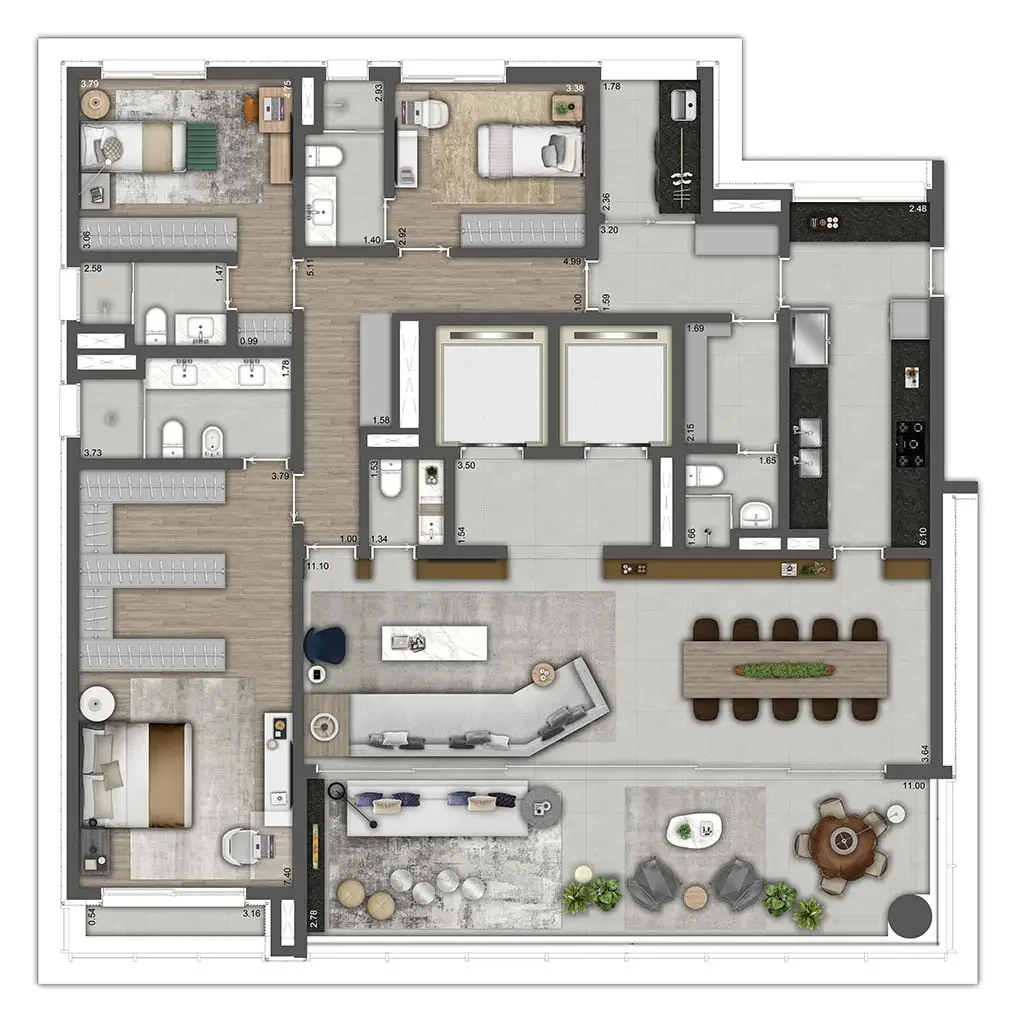 | Final 1: | 298 m² (4 suítes, 4 vagas) + depósito |